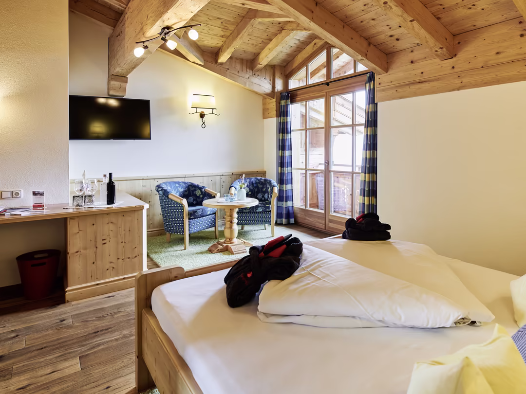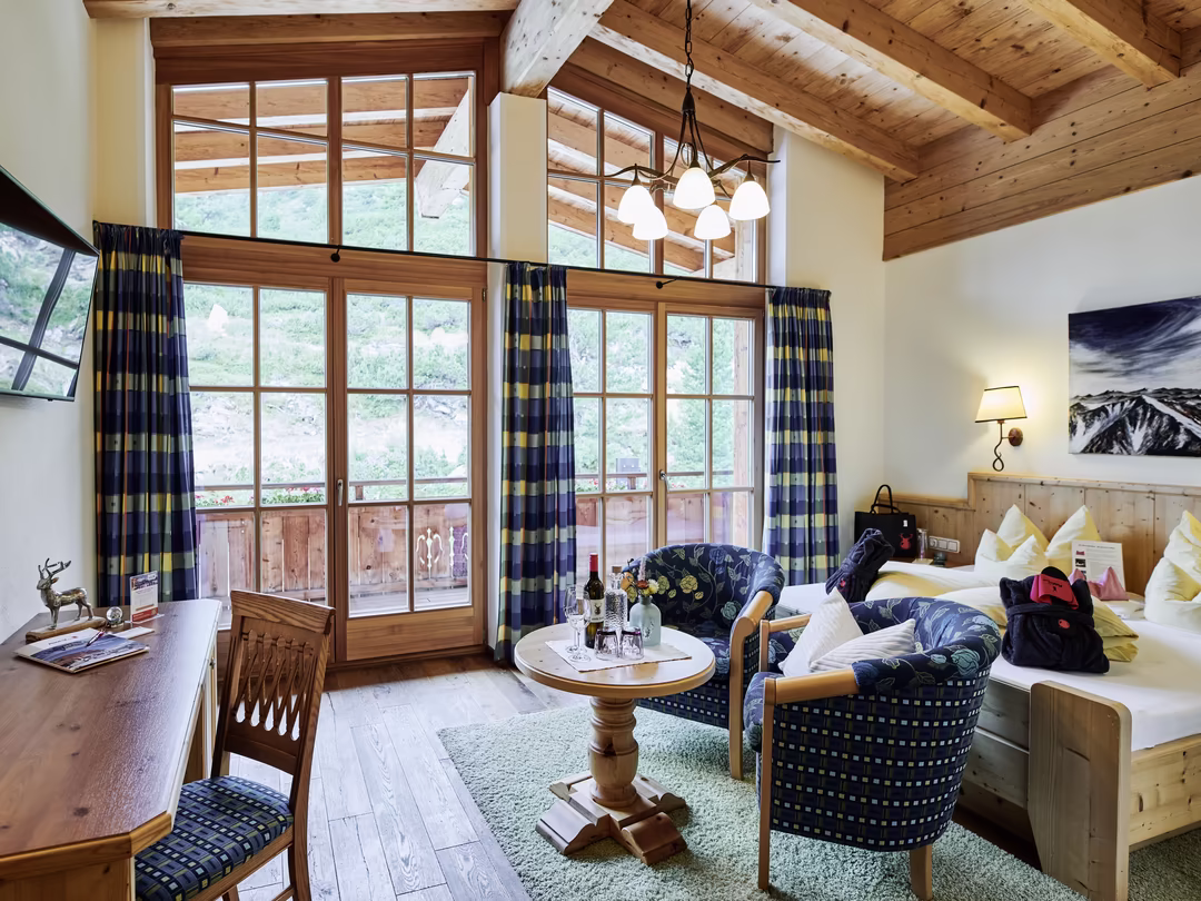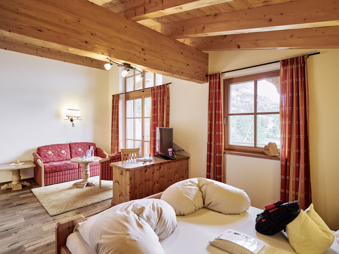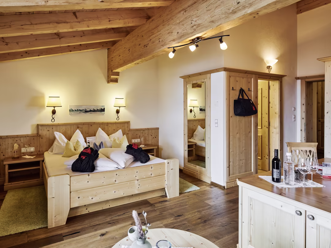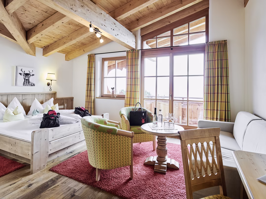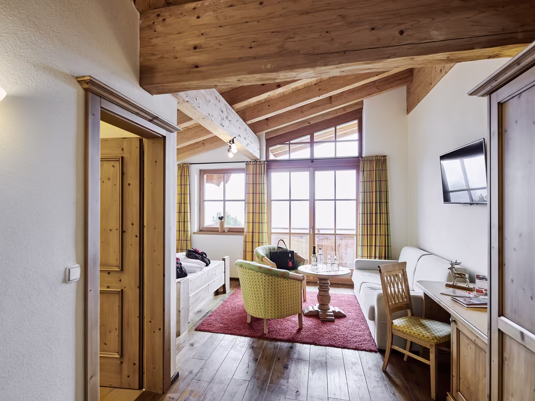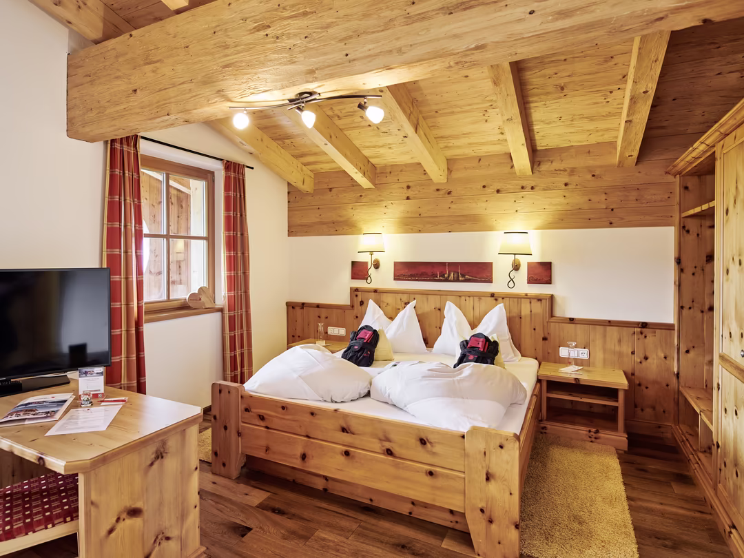 Zimmer HüttenzauberIn den zwei Doppel- und drei Familienzimmern erlebst du heimeligen Wohnkomfort, echte Tiroler Gemütlichkeit und sagenhafte Ausblicke auf die majestätische Bergwelt! Während vor dem Fenster die Schneeflocken herabrieseln, kuschelst du dich auf das Sofa oder in das weiche Bett. Auf dem privaten Balkon träumst du am Nachmittag im warmen Sonnenschein und genießt romantische Zweisamkeit unter dem funkelnden Sternenzelt! Genau so, wie man es sich von einem Urlaub auf der Alm erwartet.