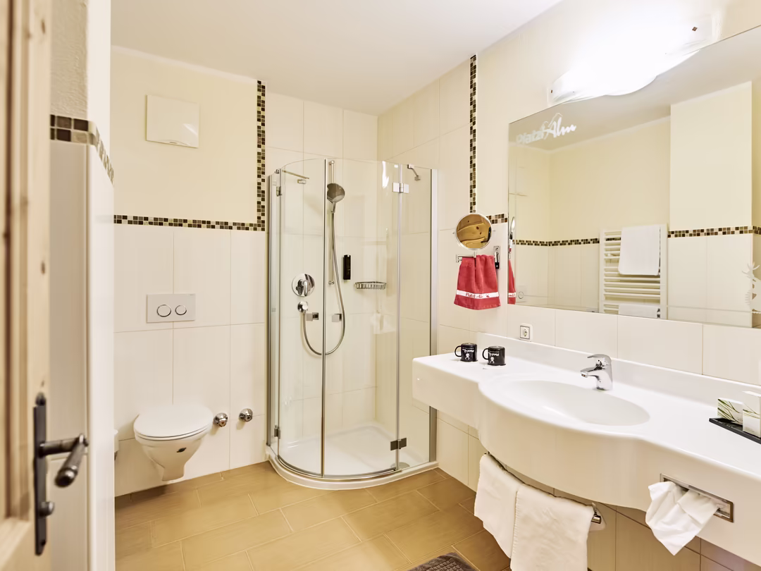 Dusche, teilweise separates WC, Balkon, Haarföhn, TV, Telefon, Safe, DVD-bzw. CD-Playeranschluss, W-LAN, Balkon, flauschige Handtücher, Badeschuhe und kuschelige Bademäntel.
